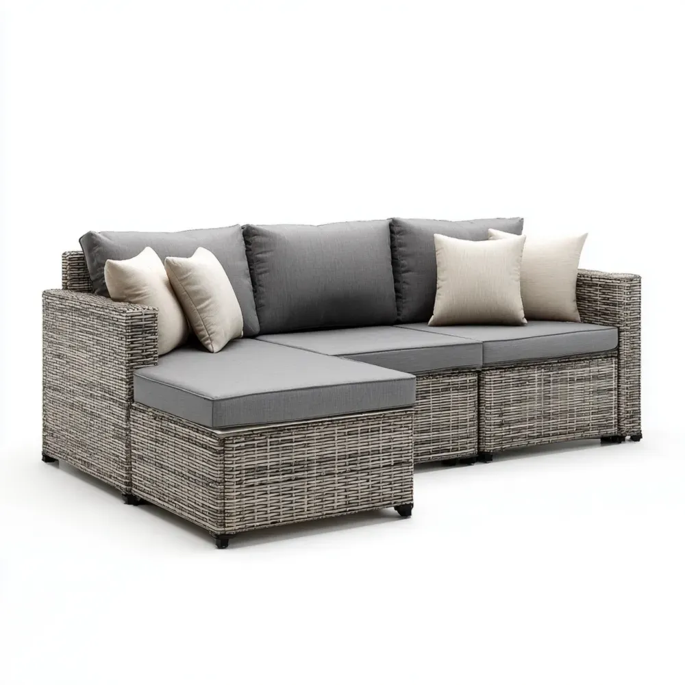 Der Rahmen besteht aus stabilem Aluminium, umhüllt von witterungsbeständigem PE-Rattan. Die grauen Polster sind aus Polyester mit einem Innenfutter aus Schaumstoff.