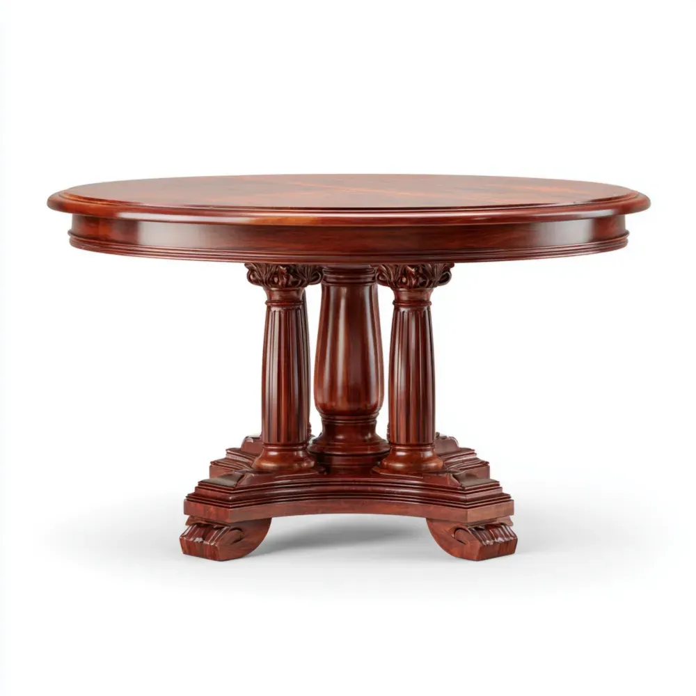 Der runde Esstisch besteht aus massivem Mahagoniholz. Sein Design verleiht jedem Innenraum einen besonderen Mittelpunkt.